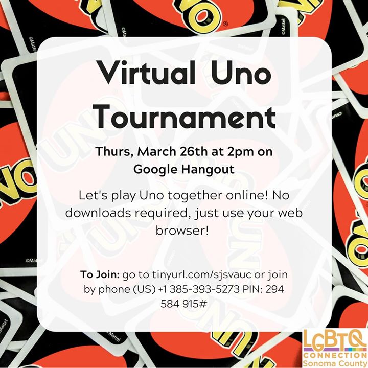 ¿Aburrido en casa? ¡Sal con nosotros! ¡Ven a jugar Uno con nosotros en la comodidad de tu hogar! Este es un evento todas las edades.